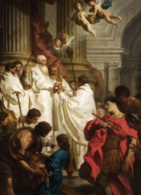 작가 : 피에르 위베르 수블레이라 (Pierre-Hubert Subleyras) 연대 : 1746년 소장 : 메트로폴리탄 미술관, 뉴욕 기법·시대 : 유화, 프랑스 바로크 유형 : 성인 서사화(전례 장면) 특징 : • 화면 중심에서 성 바실리오는 성작을 들고 미사를 집전하는 순간에 놓여 있다. • 성인의 흰 제의는 주변 인물과 대비되며 전례 행위의 중심성을 강조한다. • 사제와 부제, 신자들이 층을 이루며 배치되어 교회의 공동체적 구조를 드러낸다. • 상부에 등장하는 천사들은 전례가 지상과 천상을 잇는 행위임을 암시한다. ※ 본 작품은 18세기 서유럽 회화가 전례의 공적 성격을 강조한 흐름 속에서 바실리오 대주교를 신비 체험의 인물이 아니라 미사를 집전하는 교회의 대표자로 제시하는 성화에 해당한다. 화가는 인물의 개인적 신심보다 성작과 제단과 공동체의 배열을 전면에 배치함으로써 신앙을 사적인 경건이 아니라 교회 전체가 참여하는 질서로 시각적으로 규정한다.