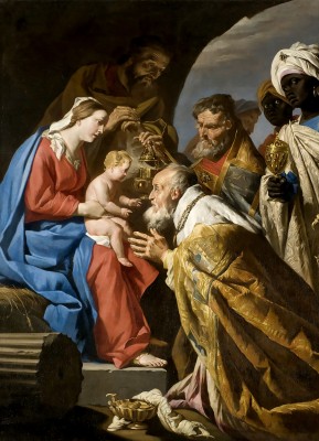 ※ 본 작품은 17세기 스페인 바로크 회화가 추구한 내면화된 경건성과 인간적 친밀감의 미학 속에서 동방 박사의 경배를 장엄한 의례가 아니라 신앙 고백이 이루어지는 가정적 장면으로 제시하는 성화에 해당한다. 무리요는 강한 명암 대비나 극적인 동작을 배제하고 부드러운 빛의 흐름과 온화한 색채를 통해 세속의 권위가 겸손과 사랑의 태도로 그리스도께 나아오는 순간을 시각화하며 반종교개혁 이후 스페인 신앙이 중시한 감성적 공감과 일상 속 신심의 방향을 분명히 드러낸다.