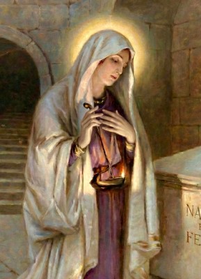 작가 : 미상 연대 : 19세기 말–20세기 초 소장 : 미상 기법·시대 : 유채, 근대 종교화 유형 : 단일 인물 경건화 특징 : • 화면 중앙의 성녀는 고개를 숙인 채 두 손을 모으고 있어, 외적 행위보다 내적 기도의 상태를 강조한다. • 부드럽게 확산되는 후광과 등불의 빛이 인물을 감싸며, 어두운 배경과 대비되어 신앙의 집중을 형성한다. • 오른편 석관에는 “NABOR ET FELIX”라는 명문이 새겨져 있어, 순교자 공경의 구체적 대상을 제시한다. • 단순한 색채와 절제된 구도는 감정의 극적 표현을 배제하고, 침묵 속 지속되는 신앙의 태도를 드러낸다. ※ 이 작품은 19세기 종교화의 아카데믹한 경향 속에서 감정의 과장보다 절제된 경건성을 중시하는 표현 방식을 따른다. 작가는 강한 극적 연출을 배제하고, 부드러운 빛과 안정된 자세, 제한된 공간 구성을 통해 인물의 시선을 외부 사건이 아닌 내면으로 집중시키려 한다. 이러한 조형 선택은 신앙을 드러나는 행위가 아니라 반복과 침묵 속에서 지속되는 상태로 제시하며, 향로의 미세한 불빛은 그 지속성을 상징적으로 드러낸다. 이 성화에서 순교는 극적인 순간이 아니라 이미 형성된 신앙의 방향이 끝까지 유지된 결과로 이해되며, 관람자는 인물의 고요한 태도 속에서 신앙의 내적 지속성을 마주하게 된다.