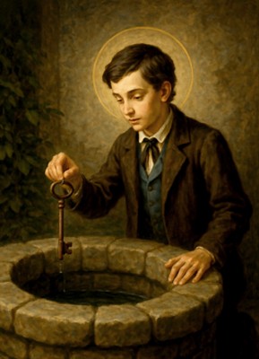 작가 : 미상 작가 연대 : 20세기경(추정) 소장 : 소장처 미상 기법·시대 : 유화 또는 디지털 복제 성화, 근현대 신심 미술 유형 : 성인 단독상(상징적 행위 장면) 특징 : • 성인은 우물가에 몸을 기울인 채 열쇠를 물속에 잠그는 동작으로 묘사된다. • 얇은 후광이 머리 둘레를 감싸며 인물의 신분을 조용히 식별한다. • 시선은 아래를 향해 집중되어 있으며, 표정은 감정을 절제한 상태를 유지한다. • 배경은 단순화되어 행위 자체가 화면의 중심 의미를 이룬다. • 우물과 열쇠라는 구체적 사물이 상징적 장치로 기능한다. ※ 본 작품은 근현대 신심 미술의 상징적 서사 방식을 통해 성 도미니코 사비오의 신앙을 결단의 행위로 시각화한 성화에 해당한다. 화가는 열쇠를 우물에 내려놓는 집중된 동작과 하향 시선을 선택함으로써, 신앙을 추상적 다짐이 아니라 유혹을 스스로 차단하는 구체적 선택으로 해석한다. 절제된 후광과 단순한 배경은 이 행위를 극적 사건이 아닌 일상 속에서 반복되는 내적 규율의 한 장면으로 고정하며, 청소년 성덕이 순간의 열정보다 지속적인 자기 통제에서 형성됨을 분명히 제시한다.