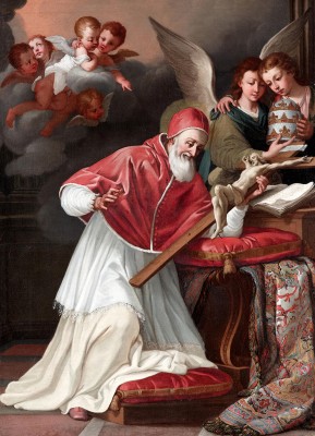 • 성인은 의자에 앉아 한 손에는 문서를 들고 다른 손에는 작은 책을 쥐고 있어 교회의 가르침과 교황의 통치 권위를 상징한다.