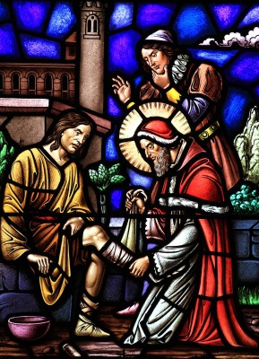 • 성 비오 5세가 무릎을 꿇고 가난한 사람의 다리를 치료하거나 돌보는 장면이 중심에 표현되어 있다.
