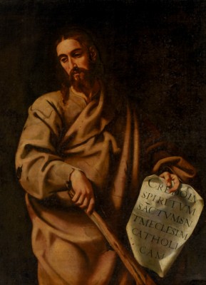 작가 : 크리스토발 가르시아 살메론 (Cristóbal García Salmerón) 연대 : 17세기 소장 : 마드리드 프라도 미술관(Museo Nacional del Prado) 기법·시대 : 유채, 스페인 바로크 유형 : 사도 단독상 특징 : • 어두운 배경 앞에 인물을 전신에 가깝게 배치하여 조형적 안정감을 형성한다. • 한 손에는 곤봉을 들고 있고, 다른 손에는 라틴어가 적힌 두루마리를 쥐고 있다. • 두루마리에는 “Credo in Spiritum Sanctum… Ecclesiam Catholicam” 등의 문구가 보인다. • 빛은 인물의 얼굴과 문서, 손에 집중되어 상징적 의미를 부각한다. ※ 이 작품은 스페인 바로크의 교의적 성격을 반영하여, 성인을 단순한 순교자가 아니라 교회의 신앙 고백을 증언하는 인물로 제시한다. 살메론은 곤봉과 두루마리를 병치함으로써, 순교와 신앙 고백을 하나의 정체성 안에 통합한다. 어둠 속에서 떠오르는 문구는 성인의 개인적 체험을 넘어 보편 교회의 신앙을 상징하며, 화면은 극적 감정보다 교리적 확언에 무게를 둔다. 이 성화에서 신앙은 고난의 기억과 함께 교회의 고백을 붙드는 책임으로 제시되며, 인물은 그 증언의 매개자로 형상화된다.