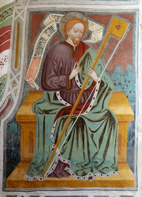 작가 : 작가 미상(Unknown) 연대 : 15세기 후반 추정 소장 : 이탈리아 남티롤 우르티예이 성 야고보 성당(Church of St. Jakob, Urtijëi, South Tyrol) 기법·시대 : 프레스코, 후기 고딕 유형 : 사도 좌상 벽화 특징 : • 장식적 테두리 안에 성인을 정면 좌상으로 배치하였다. • 황금빛 후광과 단순화된 얼굴 묘사가 성인의 신성성을 강조한다. • 한 손에는 긴 지팡이(또는 순교 도구)를 들고 있으며, 뒤에는 두루마리가 펼쳐져 있다. • 의복의 선적(線的) 주름과 평면적 색채가 후기 고딕 양식을 반영한다. ※ 이 작품은 알프스 지역 후기 고딕 벽화의 전형을 보여주며, 장식성과 상징성이 강한 형식 속에 성인을 배치한다. 작가는 입체적 공간 구성보다는 평면적 구도와 선 중심의 표현을 통해 성인의 초월적 위상을 강조한다. 지팡이와 두루마리는 사도의 권위와 가르침을 상징하며, 화면 전체는 서사적 장면이 아니라 교회의 기둥으로서의 사도를 제시한다. 이 성화에서 신앙은 역사적 사건의 재현이 아니라, 전례 공간 안에서 성인을 기억하고 공경하는 공동체적 고백의 형식으로 드러난다.