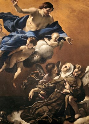 작가 : 조반니 란프랑코(Giovanni Lanfranco) 연대 : 17세기 소장 : 팔라초 피티 기법·시대 : 캔버스에 유채, 바로크 유형 : 성인화 특징 : • 구름 위의 그리스도와 천사들이 아래의 성녀를 향해 내려오는 상승적 구도 • 성녀가 탈혼 상태에서 몸을 맡긴 채 하늘을 바라보는 극적인 표현 • 강한 명암 대비와 역동적 인체 표현을 통한 바로크적 긴장감 • 다수의 천사와 인물 배치를 통한 공간의 깊이와 운동감 강조 ※ 이 작품은 17세기 바로크 양식의 특징인 역동성과 극적인 구성을 통해 성녀의 신비적 탈혼 체험을 시각화하며, 작가는 하늘과 인간 세계의 만남을 강렬한 빛과 움직임으로 표현하고, 신앙적으로는 하느님과의 합일을 향한 영혼의 상승과 은총의 체험을 드러낸다.
