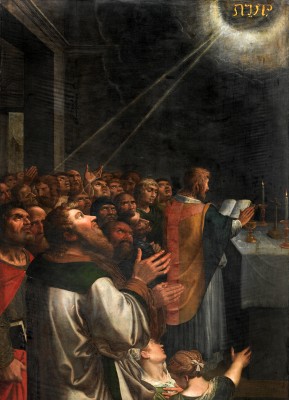 ※ 이 작품은 16세기 후반 플랑드르 회화에서 나타나는 종교개혁 이후의 신앙 표현 방식 속에서, 사도행전의 장면을 극적인 집단 서사로 재구성한다. 암브로시우스 프랑켄은 빛의 방향과 인물들의 시선을 통해 성령의 선택이라는 보이지 않는 사건을 시각적으로 드러내고자 하였다. 제단 앞에서 말씀을 펼치는 인물과 그 주위를 둘러싼 공동체의 반응은, 신앙이 개인의 체험을 넘어 공동체 안에서 인식되고 확인되는 과정임을 보여준다. 이 성화에서 바르나바는 단독 인물이 아니라, 부름을 함께 받는 사도로서 공동체 안에 위치하며, 신앙은 하늘에서 내려오는 부름과 인간의 응답이 만나는 순간 속에서 형성되는 것으로 표현된다.