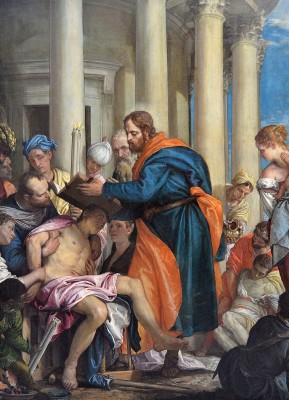 ※ 이 작품은 1566년경 베네치아 르네상스 회화의 특징을 반영하여, 성 바르나바의 치유 장면을 장엄한 역사적 사건으로 재구성한다. 베로네세는 화려한 색채와 고전적 건축 공간을 통해 신앙의 사건을 일상의 차원을 넘어선 공적이고 보편적인 장면으로 제시하고자 했다. 중심 인물의 행위와 그 주위를 둘러싼 다양한 반응은, 신앙이 개인의 기적 체험에 머무르지 않고 공동체 전체에 영향을 미치는 사건임을 강조한다. 이 성화에서 치유는 단순한 육체적 회복이 아니라, 말씀과 행위가 결합된 사도적 권위의 표현으로 나타나며, 신앙은 인간의 고통 속에 개입하여 질서를 회복하는 힘으로 제시된다.