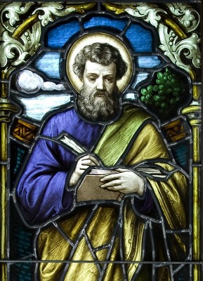 상징 : 책(복음 전승과 가르침), 두루마리(사도적 설교), 십자가 문양의 제의(사도적 권위와 교회적 사명)