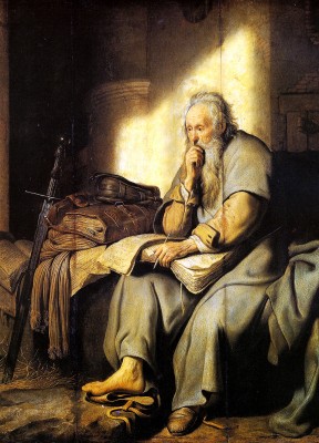 ※ 이 작품은 렘브란트 특유의 깊은 명암 대비와 절제된 구도를 통해 성 바오로를 극적인 사건의 인물이 아니라 묵상과 기록의 순간에 놓인 사도로 제시한다. 작가는 어둠 속에서 얼굴과 손에 떨어지는 빛을 통해 인물의 내적 사유와 영적 집중을 강조하며, 칼과 원고 묶음이라는 상징을 통해 순교와 가르침이라는 바오로의 사명을 함께 드러낸다. 이 성화에서 바오로는 설교의 장면보다 말씀을 기록하며 공동체를 돌보는 사도의 모습으로 나타나며, 신앙은 고요한 사유 속에서 형성되어 세상에 전해지는 진리의 책임으로 표현된다.