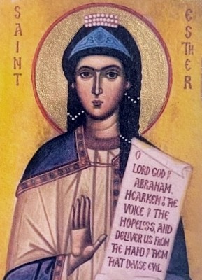 ※ 이 작품은 현대에 제작된 이콘으로서 전통적인 비잔틴 양식을 충실히 계승하면서도, 오늘날 신앙인들에게 성인의 삶을 현재적 의미로 되새기게 하려는 특징을 지닌다. 작가는 성녀 에스테르를 하느님께 간구하는 중재자로 표현하여 공동체를 위한 기도의 중요성을 강조하고자 하였으며, 신앙적으로는 두려움과 위기 속에서도 하느님께 의탁하고 용기 있게 응답하는 믿음의 자세를 오늘날에도 실천해야 함을 보여준다.