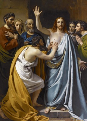 ※ 이 작품은 19세기 신고전주의의 엄격한 구성과 조형적 절제를 통해 복음의 사건을 도덕적·교리적 장면으로 승화한다. 나베즈는 감정의 격렬함보다 조화와 균형을 우선시하며, 이상화된 그리스도의 육체를 통해 부활의 존엄을 시각화한다. 토마스의 행위는 무례한 의심이 아니라, 신앙으로 이행하는 인간의 인식 행위로 재해석된다. 이 성화에서 신앙은 감정의 폭발이 아니라 질서와 빛 안에서 완성되는 고백으로 제시되며, 상처는 고통의 흔적이 아니라 구원의 증표로 드러난다.