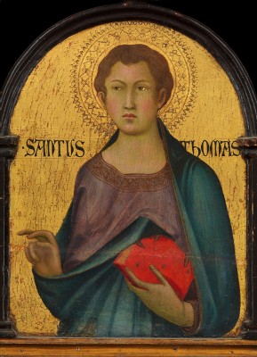 ※ 이 작품은 시에나파 고딕 회화의 장식성과 영적 세련미를 보여주는 전형적 예로, 공간의 사실적 재현보다 상징적 현존을 강조한다. 시모네 마르티니는 세속적 현실감을 최소화하고 금빛 배경 속에 성인을 초월적 존재로 제시한다. 길게 늘어진 얼굴과 절제된 표정은 감정의 극적 표현 대신 내면의 고요함을 강조한다. 이 성화에서 신앙은 역사적 사건의 재현이 아니라, 시간과 공간을 초월하여 지금 여기에서 마주하는 거룩한 현존으로 이해된다. 성 토마스는 의심의 인물이라기보다, 복음을 들고 선 교회의 증언자로 제시되며, 신앙은 교회의 전승 안에서 지속되는 진리로 형상화된다.