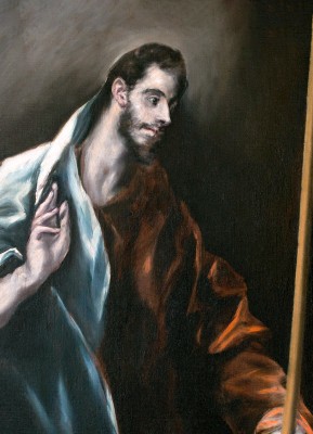※ 이 작품은 엘 그레코가 후기 매너리즘의 형식적 왜곡을 통해 사도를 단순한 역사적 인물이 아니라 영적 존재로 재구성한 사례이다. 길게 늘어진 신체와 비현실적 비례는 자연의 재현을 넘어서 초월을 향한 긴장을 시각화하며, 어두운 배경 속에서 떠오르는 얼굴과 손은 신앙의 내적 각성을 상징한다. 엘 그레코는 토마스를 ‘의심의 순간’이 아니라 이미 고백에 이른 사도의 모습으로 제시하며, 강한 명암과 신비로운 색채를 통해 신앙을 감각적 체험이 아니라 영적 응시의 상태로 표현한다. 이 성화에서 토마스는 상처를 만지는 인물이 아니라, 내면에서 확인한 진리를 전하는 증인의 형상으로 제시되며, 신앙은 육체적 확인을 넘어 빛을 향해 기울어진 영혼의 자세로 드러난다.