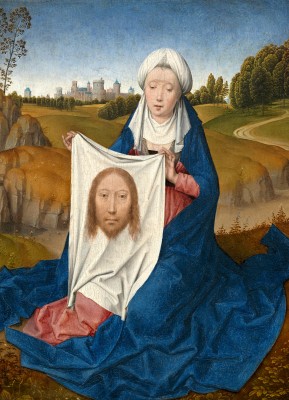 ※ 이 작품에서 한스 멤링은 바로크적 극적 긴장 대신, 북유럽 회화 특유의 세밀함과 투명한 공간 구성을 통해 성면의 의미를 조용히 드러낸다. 성녀는 감정의 격렬함 없이 수건을 펼쳐 보이며, 그 행위 자체가 증언의 형식이 된다. 배경의 도시와 길은 사건을 특정한 역사적 세계 안에 위치시키면서도, 성면은 그 시간을 초월해 관람자를 직접 마주한다. 이 성화에서 신앙은 순간적 영웅성이 아니라, 기억을 보존하고 전하는 침묵의 제시로 형상화된다.