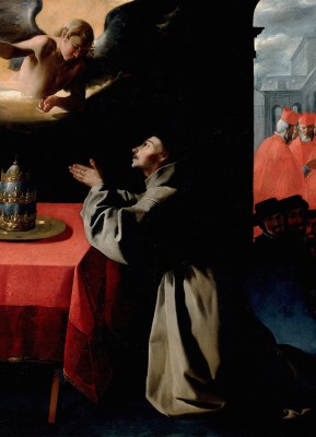 작가 : 프란시스코 데 수르바란(Francisco de Zurbarán) 연대 : 17세기 전반 소장 : 드레스덴 구회화관(Gemäldegalerie Alte Meister) 기법·시대 : 유채, 바로크 시대 유형 : 성인 서사 장면화 특징 : • 강한 명암 대비 속에서 인물과 사물만을 부각시키는 극적인 조명이 사용된다. • 무릎 꿇은 성인의 자세와 위를 향한 시선이 간절한 기도의 상태를 강조한다. • 붉은 천과 교황의 티아라는 교회의 권위와 상황의 긴장감을 시각적으로 드러낸다. • 어두운 공간 속 천사의 빛은 초월적 개입과 내적 응답의 순간을 형성한다. ※ 이 작품은 바로크 시대 특유의 극적인 명암과 단순화된 구도를 통해 신앙 체험의 내적 긴장을 강조하는 시기적 특징을 반영한다. 작가는 불필요한 배경을 제거하고 빛과 어둠의 대비 속에 인물을 배치함으로써, 교회의 중대한 결정 앞에서 하느님의 뜻을 구하는 순간에 집중하고자 했다. 이러한 표현은 신앙을 외적 권위나 제도보다, 하느님을 향한 간절한 기도와 응답의 관계로 이해하도록 이끌며, 성 보나벤투라의 기도를 통해 교회의 방향이 인간의 판단이 아니라 초월적 인도에 의해 형성된다는 신앙적 관점을 드러낸다.