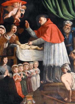 작가 : 프랑수아 롱바르(François Lombard) 연대 : 17세기 소장 : 리옹 성 보나벤투라 성당(Église Saint-Bonaventure, Lyon) 기법·시대 : 유채, 바로크 시대 유형 : 성인 기적 장면화 특징 : • 중심 인물인 성인을 밝은 빛으로 부각시키고 주변 인물은 점차 어둡게 처리하여 시선의 집중을 유도한다. • 손짓과 축복의 제스처가 기적의 순간을 명확하게 드러낸다. • 다양한 인물 군상이 배치되어 사건의 공적 성격과 공동체적 반응을 보여준다. • 천상과 지상의 구성을 대비시켜 초월적 개입과 현실 상황을 동시에 표현한다. ※ 이 작품은 바로크 시대의 극적 구성과 감정 표현을 반영하여 기적 사건을 시각적으로 강조하는 시기의 특징을 보여준다. 작가는 강한 빛과 인물 간의 대비를 통해 성 보나벤투라의 축복 행위를 중심 사건으로 부각시키며, 기적이 일어나는 순간의 긴장과 감동을 전달하고자 했다. 이러한 표현은 신앙을 단순한 내적 상태에 머무르지 않고, 하느님의 은총이 현실 안에서 드러나는 사건으로 이해하게 하며, 공동체 안에서 경험되는 기적을 통해 신앙이 공유되고 확장되는 과정을 드러낸다.