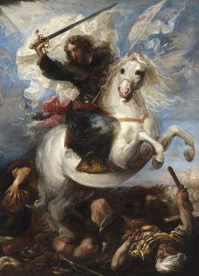 • 흰 말 위에 오른 성인이 화면 중앙을 장악하며 극적인 상승 구도를 이룬다.