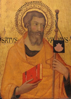 ※ 이 작품은 시에나 화파 특유의 장식성과 영적 우아함을 보여준다. 시모네 마르티니는 금빛 배경과 섬세한 선묘를 통해 성 야고보를 현실 공간에서 분리된 성스러운 차원에 배치한다. 인물의 고요한 측면 시선과 정제된 제스처는 극적 서사보다 내적 품위를 강조하며, 붉은 책과 순례 상징은 사도의 사명을 간결하게 제시한다. 이 성화에서 신앙은 역사적 사건의 긴박함이 아니라, 빛과 장식 속에 정지된 영원의 상태로 표현되며, 성인은 초월적 질서 안에 속한 존재로 시각화된다.