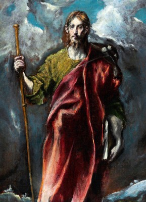 ※ 이 작품은 엘 그레코 후기 양식의 전형적 특징을 보여준다. 작가는 사도를 상징물 없이 단독으로 제시함으로써 외적 표지보다 내적 상태에 집중한다. 왜곡된 비례와 흔들리는 붓질은 육체의 안정감을 해체하고, 인물을 초월적 차원에 놓인 존재처럼 보이게 한다. 이 성화에서 신앙은 서사적 사건이나 상징의 명시가 아니라, 내면의 고독과 영적 긴장 속에서 드러나며, 성 야고보는 역사적 인물이기보다 빛과 그림자 사이에 놓인 영혼의 형상으로 재해석된다.