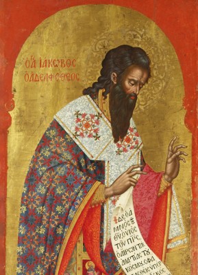 ※ 이 작품은 후기 비잔틴 전통 속에서 성인을 역사적 인물이라기보다 교회의 영적 기둥으로 제시한다. 스테파노스 찬가롤라스는 평면적 구성과 상징적 색채를 유지하면서도 세밀한 문양과 장식으로 성인의 권위를 강조한다. 공간은 제거되고 금빛 배경은 영원의 차원을 상징하며, 인물의 절제된 제스처는 교회의 가르침을 전하는 사목자의 역할을 드러낸다. 이 성화에서 신앙은 감정적 표현보다 전례와 교회적 질서 안에서 보존되는 진리로 나타나며, 성 야고보는 공동체를 인도하는 영적 스승으로 형상화된다.