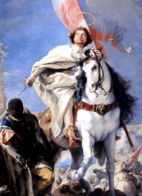 ※ 이 작품은 스페인에서 형성된 ‘산티아고 마타모로스(Santiago Matamoros)’ 도상을 로코코적 감각으로 재해석한 예이다. 티에폴로는 전통적 전투 서사를 경쾌한 색채와 공기감 있는 공간 처리로 이상화하며, 성인을 역사적 전사의 모습으로 영웅화한다. 인물과 말의 역동적 곡선은 천상과 지상을 연결하는 상승 운동을 형성하고, 이는 단순한 전쟁 장면을 넘어 신적 섭리가 개입한 승리의 상징으로 읽힌다. 이 성화에서 신앙은 민족적 정체성과 결합된 수호의 상징으로 제시되며, 성 야고보는 전투의 한복판에서 하늘의 빛을 반사하는 초월적 수호자로 형상화된다.
