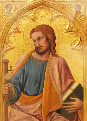 ※ 이 작품은 후기 고딕의 장식성과 초기 르네상스적 인물 표현이 공존하는 크리벨리 특유의 양식을 보여준다. 금박 배경은 현실 공간을 제거하고 성인을 초월적 차원에 배치하며, 선명한 윤곽과 세밀한 세공은 성인의 권위를 시각적으로 고정한다. 작가는 조개와 지팡이, 책이라는 상징을 정면에 배치하여 성 야고보의 정체성을 분명히 하면서도, 인물의 고요한 측면 시선을 통해 내적 묵상의 분위기를 형성한다. 이 성화에서 신앙은 역사적 여정의 인물이면서 동시에 영원한 차원에 속한 존재로 제시되며, 장식적 황금 공간은 그 영적 존엄을 드러내는 시각적 장치로 작용한다.