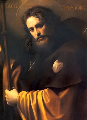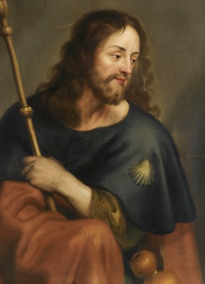 • 어깨에 걸린 조개와 순례자의 지팡이는 성 야고보의 상징을 명확히 드러낸다.