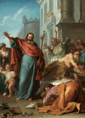 ※ 이 작품은 프랑스 18세기 회화 특유의 고전적 구성과 감정 표현의 균형을 보여준다. 코이펠은 성인을 중심에 두고 주변 인물들의 다양한 반응을 통해 기적의 효과를 서사적으로 전개한다. 사도의 제스처는 고전 조각을 연상시키는 장중한 동작으로, 신적 권능을 시각적으로 명료화한다. 건축적 배경은 질서와 안정의 상징으로 기능하며, 기적은 혼란이 아니라 회복과 조화의 회복으로 해석된다. 이 성화에서 신앙은 공동체 안에서 체험되는 치유와 은총의 사건으로 드러나며, 성 야고보는 단순한 순교자가 아니라 살아 있는 중재자이자 기적의 도구로 형상화된다.