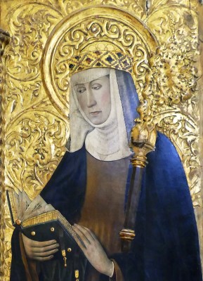 이 작품은 카탈루냐 고딕 특유의 장식성과 상징성을 보여 준다. 금박 배경은 현실 공간을 제거하고 초월적 차원을 형성하며, 이는 중세 제단화의 전형적 신학적 공간 구성 방식이다. 성녀가 들고 있는 책은 수도 규칙과 영적 지혜를, 지팡이는 영적 인도자적 성격을 상징한다. 작가는 사실적 묘사보다는 상징적 제시를 선택하여, 성녀를 역사적 인물이라기보다 교회적 권위와 성덕의 표상으로 제시한다. 이 성화는 중세 후기 교회가 성인을 교리적·상징적 체계 안에서 시각화하던 방식을 반영하며, 장식적 금박과 정면 제시는 신앙의 초월성과 교회적 위계를 강조하는 역할을 한다.