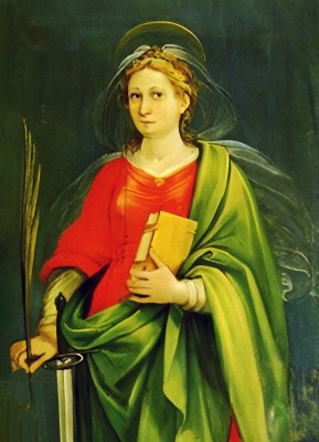 • 한 손에 든 종려가지와 다른 손의 검이 순교의 상징을 명확히 제시한다.