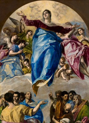 ※ 이 작품은 르네상스 자연주의를 넘어선 매너리즘 양식 속에서 성모 승천을 신비적 체험으로 재해석한 대표적 사례로, 비현실적으로 길어진 인체와 왜곡된 공간을 통해 초월적 차원을 강조하는 미술사적 의미를 지닌다. 엘 그레코는 강렬한 색채와 소용돌이치는 형태를 통해 물질적 세계를 해체하고 영적 상승의 흐름을 시각화하려는 의도를 드러내며, 상부의 빛과 하부의 인간 군상을 극적으로 대비시킨다. 특히 성모의 초월적 자세와 하늘을 향한 시선은 인간 존재가 하느님께로 들어 올려지는 신비를 상징하며, 이 성화는 성모 마리아가 은총 안에서 영화롭게 승천하여 하늘의 영광에 참여한다는 신앙을 강렬하고 신비적인 방식으로 표현한다.