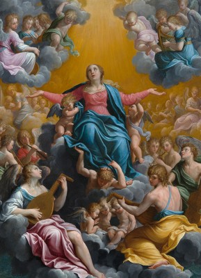 ※ 이 작품은 초기 바로크 회화에서 고전적 이상미와 경건성을 결합한 성모 승천 도상의 대표적 사례로, 르네상스적 균형과 바로크적 빛의 효과가 조화를 이루는 미술사적 의미를 지닌다. 귀도 레니는 과도한 극적 표현을 절제하고 부드러운 색채와 조화로운 구도를 통해 천상 세계의 질서를 평온하게 제시하려는 의도를 보이며, 천사들의 음악적 배치는 하늘의 조화와 기쁨을 시각화한다. 특히 위를 향한 성모의 시선과 펼쳐진 손은 하느님 은총에 대한 전적인 수용과 찬미를 상징하며, 이 성화는 성모 마리아가 육신과 영혼으로 영화롭게 하늘에 들어 올려져 천상 영광에 참여한다는 신앙을 고요하고 이상화된 방식으로 드러낸다.