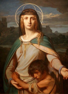 작가 : 알렉상드르 카바넬(Alexandre Cabanel) 연대 : 19세기 후반 소장 : 미국 밀워키 미술관(Milwaukee Art Museum) 기법·시대 : 유화, 19세기 아카데미즘 유형 : 성인 단독상(서사적 요소 포함) 특징 : • 성녀 모니카는 젊은 인물을 품에 안은 보호자의 자세로 묘사되어 어머니로서의 중보와 돌봄을 강조한다. • 고요한 정면 시선과 이상화된 얼굴은 감정의 격렬함보다 덕성과 품위를 부각하는 아카데미즘의 특징을 보여준다. • 인물의 매끈한 피부 묘사와 절제된 명암은 형태의 명확성과 조형적 안정감을 형성한다. • 배경 풍경은 서정적 분위기를 더하며 성녀의 내적 평온과 신뢰를 상징적으로 확장한다. ※ 이 작품은 19세기 아카데미즘 회화의 특징인 이상화된 인물 표현과 균형 잡힌 구도를 통해 성녀 모니카를 고요한 덕성과 품위의 인물로 제시한 성화이다. 미술사적으로 아카데미즘은 고전적 아름다움과 안정된 형태를 강조하여 인물을 이상화된 도덕적 모범으로 표현하는 경향을 지니며, 작가는 부드러운 명암과 조화로운 풍경을 통해 성녀의 평온한 내면을 드러낸다. 작가의 의도는 모니카의 삶을 고통의 서사로 강조하기보다 어머니로서의 보호와 중보의 상징으로 제시하는 데 있으며, 젊은 인물을 품에 안은 모습은 그녀의 사랑과 돌봄을 시각적으로 상징한다. 신앙적 측면에서 이 성화는 아들 성 아우구스티노의 회심을 위해 인내하며 기도했던 어머니의 믿음을 묵상하게 하며, 지속적인 기도와 신뢰가 결국 화해와 회복으로 이어진다는 희망의 메시지를 전달한다.