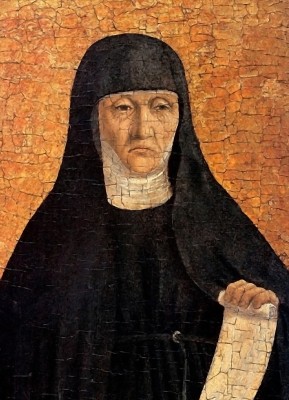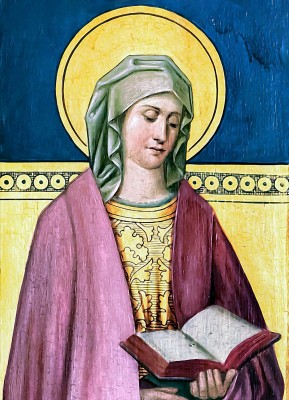 작가 : 작자 미상 연대 : 중세 후기(추정) 소장 : 독일 트라이스 성 요한 세례자 교회(Church of St. John the Baptist, Treis) 기법·시대 : 벽화(프레스코/템페라 계열), 중세 종교미술 유형 : 성인 단독상 특징 : • 성녀는 책을 들고 고개를 숙인 자세로 묘사되어 평생의 기도와 묵상을 상징한다. • 금색 후광과 장식 띠는 성인의 거룩함을 강조하면서도 평면적 구성으로 상징성을 강화한다. • 단순화된 형태와 선명한 색면은 교회 내부 장식 성화의 교육적·신심적 목적을 드러낸다. • 절제된 표정과 안정된 구도는 감정보다 덕성과 신앙의 지속성을 강조한다. ※ 이 작품은 중세 교회 벽화 전통 속에서 성녀 모니카를 공동체 신앙의 모범으로 제시한 성화이다. 미술사적으로 중세 성화는 사실적 묘사보다 상징성과 교육적 기능을 중시하며, 평면적인 색면과 단순화된 형태를 통해 신앙의 의미를 명확하게 전달하는 특징을 지닌다. 작가는 이러한 양식을 통해 성녀의 개인적 감정보다 기도와 인내라는 덕목을 강조하려 하며, 책과 숙인 자세를 통해 묵상과 간청의 삶을 상징적으로 표현한다. 신앙적 측면에서 이 성화는 아들 성 아우구스티노의 회심을 위해 끊임없이 기도했던 어머니의 믿음을 공동체가 본받아야 할 모범으로 제시하며, 교회 안에서 지속되는 기도와 신뢰의 신앙을 묵상하게 하는 영적 메시지를 전한다.
