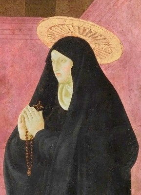 작가 : 파올로 우첼로(Paolo Uccello) 연대 : 1430–1435년경 소장 : 우피치 미술관(Galleria degli Uffizi), 피렌체 기법·시대 : 템페라, 초기 르네상스 유형 : 성인 단독상 특징 : • 성녀는 검소한 수도복 차림으로 묵주를 들고 기도하는 모습으로 표현되어 끊임없는 간구의 삶을 상징한다. • 옅은 분홍색 배경과 단순화된 색면은 초기 르네상스 특유의 평면성과 영적 집중을 강화한다. • 또렷한 윤곽과 절제된 표정은 감정의 과장보다 신앙의 지속성과 인내를 강조한다. • 후광의 간결한 처리와 정적인 자세는 성녀를 관조와 모범의 대상으로 제시한다. ※ 이 작품은 초기 르네상스 회화의 특징인 단순한 색면 구성과 명확한 윤곽을 통해 성녀 모니카를 기도의 인물로 정제하여 표현한 성화이다. 미술사적으로 파올로 우첼로는 형태와 구조의 명확성을 중시한 화가로 알려져 있으며, 이 작품에서도 장식적 요소를 최소화하여 인물의 영적 의미에 집중하도록 한다. 작가의 의도는 성녀 모니카의 삶을 극적인 감정의 장면보다 끊임없는 기도와 인내의 태도로 보여 주는 데 있으며, 묵주를 든 손과 절제된 표정을 통해 신앙의 지속성을 강조한다. 신앙적 측면에서 이 성화는 아들 성 아우구스티노의 회심을 위해 평생 간구했던 어머니의 믿음을 묵상하게 하며, 반복되는 기도와 신뢰 속에서 신앙이 성숙해 간다는 영적 메시지를 전달한다.