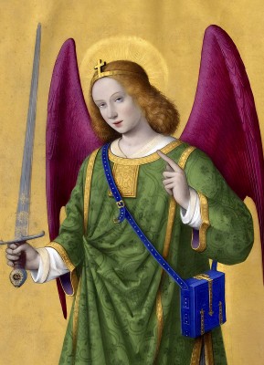 ※ 이 작품은 프랑스 궁정 후기 고딕에서 초기 르네상스로 넘어가는 시기의 필사본 미니아투르 전통을 보여 주는 작품으로, 금박 배경과 정교한 채색을 통해 천상의 위계를 장식적으로 표현한 궁정 신심 미술의 특징을 잘 드러낸다. 장 부르디숑은 검과 성서 가방이라는 상징적 도상을 통해 대천사 라파엘을 하느님의 정의와 보호를 수행하는 사자로 명확히 제시하고자 하였으며, 인물의 우아한 자세와 장식적 색채를 통해 궁정 필사본 미술 특유의 세련된 표현을 완성하였다. 이러한 이미지는 개인 기도서를 사용하는 신자가 묵상 속에서 하느님의 보호와 인도를 기억하도록 돕는 신앙적 기능을 수행하며, 천상의 사자가 인간의 삶을 돌본다는 교회의 전통적 믿음을 시각적으로 전하는 역할을 한다.