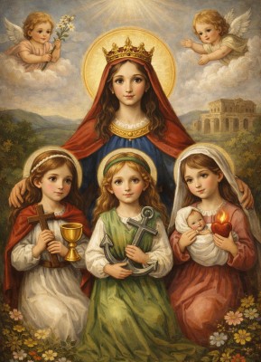 ※ 본 작품은 현대 디지털 종교화 양식으로 제작된 성화로, 전통적 이콘 도상과 상징 체계를 현대적 시각 언어로 단순화하여 제시하는 미술사적 특징을 보인다. 작가는 성녀 소피아를 중심에 두고 세 딸에게 각각의 상징물을 부여함으로써 믿음·희망·사랑이라는 신학적 덕을 직관적으로 이해하도록 표현하고자 하였으며, 밝고 따뜻한 색채와 부드러운 인물 표현은 고통의 순교 서사보다 덕의 의미를 강조하는 방향으로 구성되어 있다. 이러한 형식은 어린이와 신자들이 덕의 의미를 친근하게 이해하도록 돕는 신심적 교육 이미지로서, 신앙이 역사적 사건을 넘어 삶 속에서 실천되는 영적 가치임을 묵상하게 하는 신앙적 의미를 전달한다.