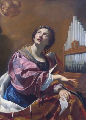 작가 : 구에르치노(Guercino, Giovanni Francesco Barbieri) 연대 : 1649년 소장 : 덜위치 픽처 갤러리(Dulwich Picture Gallery), 런던 기법·시대 : 유채, 이탈리아 바로크 유형 : 성인 단독상(음악 성인상) 특징 : • 오르간 앞에 앉아 고개를 숙인 채 연주에 몰입한 모습으로 묘사된다. • 부드러운 명암과 절제된 색채가 구에르치노 특유의 바로크 양식을 보여준다. • 성녀의 고요한 자세는 내적 침묵과 관상적 기도를 강조한다. • 은은한 성광은 성녀의 거룩함과 영적 집중을 드러낸다. • 화면 전체의 차분한 분위기는 음악을 통한 영적 찬미의 의미를 강조한다. ※ 본 작품은 이탈리아 바로크 회화 전통 안에서 명암 대비와 감정의 절제를 통해 성인의 내적 신앙을 표현하는 미술사적 특징을 보여준다. 작가는 오르간 앞에 몰입한 성녀의 조용한 자세와 부드러운 빛의 흐름을 통해 성녀 세실리아의 관상적 기도와 음악적 봉헌을 강조하였으며, 이러한 표현은 음악이 단순한 연주를 넘어 하느님께 드리는 영적 찬미와 기도의 행위임을 상징적으로 드러낸다.