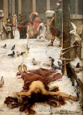 ※ 본 작품은 19세기 후기 라파엘전파 종교화 전통 속에서 성인의 순교를 서정적이고 묵상적인 장면으로 제시하는 성화에 해당한다. 작가 존 윌리엄 워터하우스는 눈 덮인 공간과 정지된 인물 구성을 통해 성녀 에울라리아의 순교를 극적인 폭력의 순간이 아니라 침묵 속에서 드러나는 숭고함과 영적 승리의 장면으로 표현하고자 하였으며, 이러한 표현은 관람자가 순교 이후에 완성되는 성덕과 신앙의 의미를 묵상하도록 이끄는 신앙적 메시지를 전달한다.