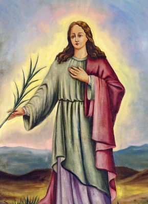 • 성녀는 종려나무 가지와 책을 함께 들고 서 있어 순교자이자 신앙의 증인으로 제시된다.