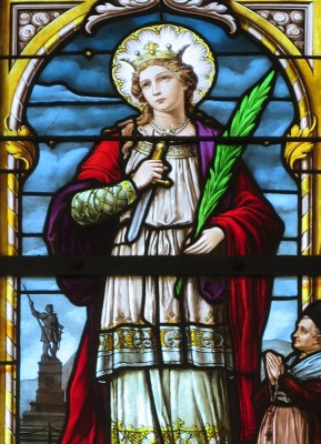 • 왕관과 두광을 착용한 성녀가 정면을 향해 서 있으며, 오른손에는 칼, 왼손에는 종려가지를 들고 있다.