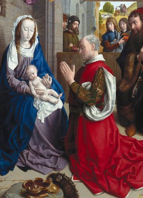 ※ 본 작품은 15세기 초기 네덜란드 회화가 발전시킨 사실적 관찰과 제단화 전통 속에서 동방 박사의 경배를 인간 권위가 구원의 신비 앞에서 질서 있게 낮아지는 행위로 제시하는 성화에 해당한다. 후고 판 데르 고스는 노년의 박사를 중심에 배치하고 전경의 왕관과 예물을 강조함으로써 경배를 감정의 고조가 아닌 의식화된 복종의 태도로 규정하며 세밀한 일상 묘사와 깊이 있는 색채 대비를 통해 구원 사건이 초월적 상징이 아니라 역사적 현실 속에서 인식되고 공경되는 신앙의 중심임을 시각적으로 정착시킨다.다. 성모 마리아는 고요하고 절제된 자세로 아기 예수를 안고 있으며, 아기 예수는 인간적 연약함과 동시에 신적 위엄을 함께 드러낸다.