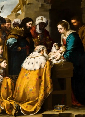 ※ 본 작품은 17세기 스페인 바로크 회화가 추구한 내면화된 경건성과 인간적 친밀감의 미학 속에서 동방 박사의 경배를 장엄한 의례가 아니라 신앙 고백이 이루어지는 가정적 장면으로 제시하는 성화에 해당한다. 무리요는 강한 명암 대비나 극적인 동작을 배제하고 부드러운 빛의 흐름과 온화한 색채를 통해 세속의 권위가 겸손과 사랑의 태도로 그리스도께 나아오는 순간을 시각화하며 반종교개혁 이후 스페인 신앙이 중시한 감성적 공감과 일상 속 신심의 방향을 분명히 드러낸다.