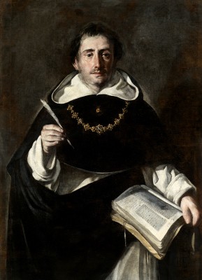 작가 : 안토니오 델 카스티요 이 사아베드라 (Antonio del Castillo y Saavedra) 연대 : 17세기 중반(1600–1649년경) 소장 : 코르도바 미술관(Museo de Bellas Artes de Córdoba) 기법·시대 : 유화, 스페인 바로크 유형 : 성인 단독상(학자 초상) 특징 : • 성인은 정면에 가까운 반신상으로 어두운 배경 속에 배치된다. • 명암 대비가 강한 조명은 얼굴과 손, 책에 집중되며 주변 공간은 절제된다. • 한 손에 든 깃펜과 펼쳐진 책은 사유와 집필 행위를 직접적으로 드러낸다. • 의복의 흑백 대비와 간결한 장식은 금욕적 학문 태도를 강조한다. • 인물의 시선은 관람자를 향해 열려 있으나 감정 표현은 최소화되어 있다. ※ 본 작품은 17세기 스페인 바로크 회화가 추구한 절제된 사실성과 명암 효과를 통해 성 토마스 아퀴나스를 신비적 성인보다 신학적 사유의 주체로 제시하는 성화에 해당한다. 안토니오 델 카스티요는 어두운 배경 속에서 얼굴과 손, 필기 도구만을 선택적으로 부각시키는 조명 구성을 통해 신앙을 환시나 상징적 광휘가 아닌 이성적 탐구의 행위로 시각화한다. 이는 반종교개혁 이후 스페인 교회가 신학을 내적 경건과 교리적 명료성의 결합으로 이해했던 시대적 신앙 환경을 반영하며, 중세적 초월성을 강조한 금박 성화 전통과 구별되는 바로크적 신앙 감각을 분명히 드러낸다.