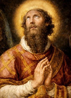 작가 : 무명 작가 (AI 화질 보정) 연대 : 17세기경(추정) 소장 : 이탈리아 로마, 산타 수산나 성당 기법·시대 : 프레스코(벽화), 바로크 초기(추정) 유형 : 순교 성인 부분상(기도 장면) 특징 : • 성 가비노는 주교복 또는 성직자 예복과 금빛 후광으로 식별된다. • 두 손을 모아 가슴 앞에 둔 기도 자세와 위를 향한 시선이 강조된다. • 따뜻한 명암과 후광의 빛 처리가 인물의 내적 경건을 부각한다. • 부분 장면임에도 인물의 정신적 태도가 화면 중심을 이룬다. ※ 본 작품은 17세기 로마 바로크 초기의 경건 회화 전통 속에서 성 가비노를 극적인 순교 장면이 아니라 기도에 잠긴 정지된 순간으로 제시하는 성화에 해당한다. 화가는 인물의 시선을 하늘로 들어 올리고 두 손을 밀착시킨 폐쇄적 제스처를 선택함으로써, 순교를 사건의 기억이 아니라 하느님께 향한 지속적 순명의 상태로 해석한다. 금빛 후광과 부드러운 명암 대비는 로마 초기 순교자 숭배 전통이 강조한 초월적 영광을 시각적으로 부여하면서도, 과도한 감정 표출을 절제하여 신앙을 내면화된 태도로 응축한다.