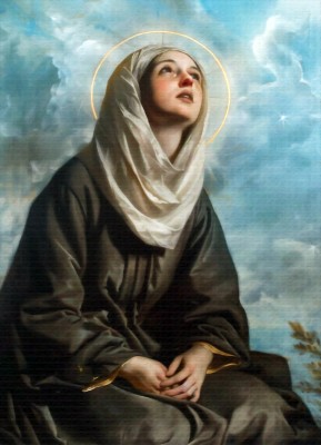 상징 : 십자가(회개와 사랑), 묵주(기도의 지속), 눈물(참회와 정화), 거친 옷(속죄와 절제)