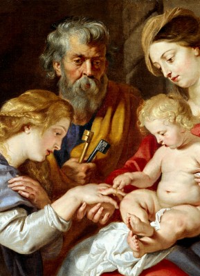 작가 : 페테르 파울 루벤스 (Peter Paul Rubens) 연대 : 약 1640년경 소장 : 휴스턴 미술관 기법.시대 : 캔버스에 유채, 플랑드르 바로크 유형 : 성인 단독상(신비적 결혼 장면) 특징 : • 아기 예수가 성녀 카타리나의 손가락에 반지를 끼워 주는 장면을 중심으로 신비적 결혼의 도상을 명확히 제시한다. • 성모 마리아와 성 요셉이 곁에서 이를 지켜보는 구성은 사건의 교회적·구원사적 의미를 강조한다. • 루벤스 특유의 풍부한 육체 표현과 따뜻한 색채는 신비 체험을 인간적 친밀감 속에서 생동감 있게 전달한다. • 인물들의 시선과 손짓이 원형 구도를 이루며, 성녀의 헌신과 그리스도의 선택이 상호 응답하는 관계로 표현된다. ※ 이 작품은 플랑드르 바로크 회화의 대표적 거장 루벤스가 성녀 카타리나의 ‘신비적 결혼’ 장면을 풍부한 색채와 역동적인 구성 속에 형상화한 성화이다. 루벤스는 아기 예수가 성녀의 손가락에 반지를 끼워 주는 순간을 중심에 두고 성모 마리아와 성 요셉을 함께 배치하여 이 결합이 단순한 개인적 환시가 아니라 교회와 그리스도의 사랑 안에서 이루어지는 영적 결합임을 강조하였다. 인물들의 시선과 손짓이 서로를 향해 원형의 흐름을 이루는 구성과 생동감 있는 육체 표현은 바로크 특유의 인간적 친밀감과 감각적 생기를 드러내며, 신비 체험을 현실적이고 따뜻한 관계 속 사건으로 표현한다. 이러한 묘사는 신앙적으로 성녀 카타리나가 그리스도께 자신을 완전히 봉헌한 영혼임을 상징하며, 그리스도와 영혼의 사랑의 결합이라는 신비를 생동감 있게 묵상하도록 이끄는 바로크 종교 회화의 한 전형을 보여준다.