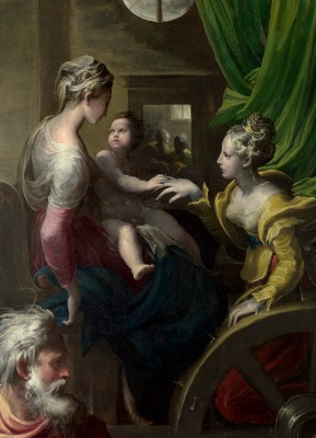작가 : 파르미자니노 (Parmigianino) 연대 : 1531년 소장 : 내셔널 갤러리 기법.시대 : 패널에 유채, 이탈리아 매너리즘 유형 : 성인 단독상(신비적 결혼 장면) 특징 : • 아기 예수가 성녀 카타리나의 손에 반지를 끼워 주는 순간을 중심으로, 신비적 결혼의 핵심 도상을 간결하게 제시한다. • 늘씬하게 신장된 인물 비례와 부드럽게 뒤틀린 자세는 매너리즘 특유의 우아한 긴장감을 형성한다. • 성모 마리아의 침착한 시선과 성녀의 겸손한 자세가 대비를 이루며, 인간적 친밀함 속에서 초월적 사건이 전개된다. • 차분한 실내 공간과 절제된 색채는 감각적 극적 효과보다 관상적 깊이에 초점을 맞춘다. ※ 이 작품은 이탈리아 매너리즘 회화를 대표하는 파르미자니노가 성녀 카타리나의 신비적 결혼을 우아하고 세련된 형식 속에 표현한 성화이다. 아기 예수가 성녀의 손에 반지를 끼워 주는 장면을 중심으로 성모 마리아가 이를 지켜보는 구성은 그리스도와 영혼의 영적 결합을 상징적으로 드러내며, 길게 신장된 인물 비례와 부드럽게 뒤틀린 자세는 매너리즘 특유의 긴장과 우아한 리듬을 형성한다. 절제된 색채와 차분한 공간은 극적 사건보다 관상적 분위기를 강조하며, 인물들 사이의 부드러운 시선 교환은 인간적 친밀함 속에서 이루어지는 초월적 은총의 순간을 드러낸다. 이러한 표현은 신앙적으로 성녀 카타리나가 그리스도께 자신을 전적으로 봉헌한 영혼임을 상징하며, 영혼과 그리스도의 사랑의 결합이라는 신비를 조용하고도 깊이 묵상하게 하는 매너리즘 종교 회화의 특징을 보여준다.