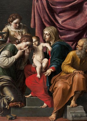 작가 : 루치오 마사리 (Lucio Massari) 연대 : 17세기 초 소장 : 에르미타주 미술관 기법.시대 : 캔버스에 유채, 이탈리아 바로크 유형 : 성인 단독상(신비적 결혼 장면) 특징 : • 아기 예수가 성녀 카타리나의 손에 반지를 끼워 주는 신비적 결혼의 핵심 장면을 중심으로 구성된다. • 성모 마리아와 성 요셉이 양측에 배치되어 사건의 신학적 공인을 상징하며, 천사들이 경건한 분위기를 보완한다. • 볼로냐 화파 특유의 안정된 삼각 구도와 절제된 동작이 장면에 명확한 질서를 부여한다. • 부드러운 명암과 따뜻한 색조는 극적 과장보다 내적 헌신과 관상적 분위기를 강조한다. ※ 이 작품은 17세기 초 이탈리아 바로크 초기, 특히 볼로냐 화파의 고전적 균형과 질서를 보여주는 성화로 루치오 마사리는 성녀 카타리나의 신비적 결혼 장면을 안정된 삼각 구도 속에 배치하여 조화롭고 명확한 구조로 제시하였다. 아기 예수가 성녀의 손에 반지를 끼워 주는 중심 장면을 중심으로 성모 마리아와 성 요셉, 그리고 천사들이 둘러선 구성은 이 결합이 단순한 개인적 환시가 아니라 교회적 차원에서 이해되는 영적 사건임을 강조한다. 부드러운 명암과 따뜻한 색조, 절제된 동작은 극적인 감정 표현보다 내적 헌신과 관상적 분위기를 드러내며, 신앙적으로는 성녀 카타리나가 그리스도께 자신을 온전히 봉헌한 영혼임을 상징하고 영혼과 그리스도의 사랑의 결합이라는 신비를 교회의 공동체적 시선 안에서 묵상하도록 이끄는 바로크 초기 종교 회화의 특징을 보여준다.