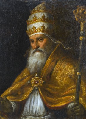 • 성인은 측면을 향한 단정한 자세로 표현되어 교황 초상화의 전통적 형식을 따른다.
